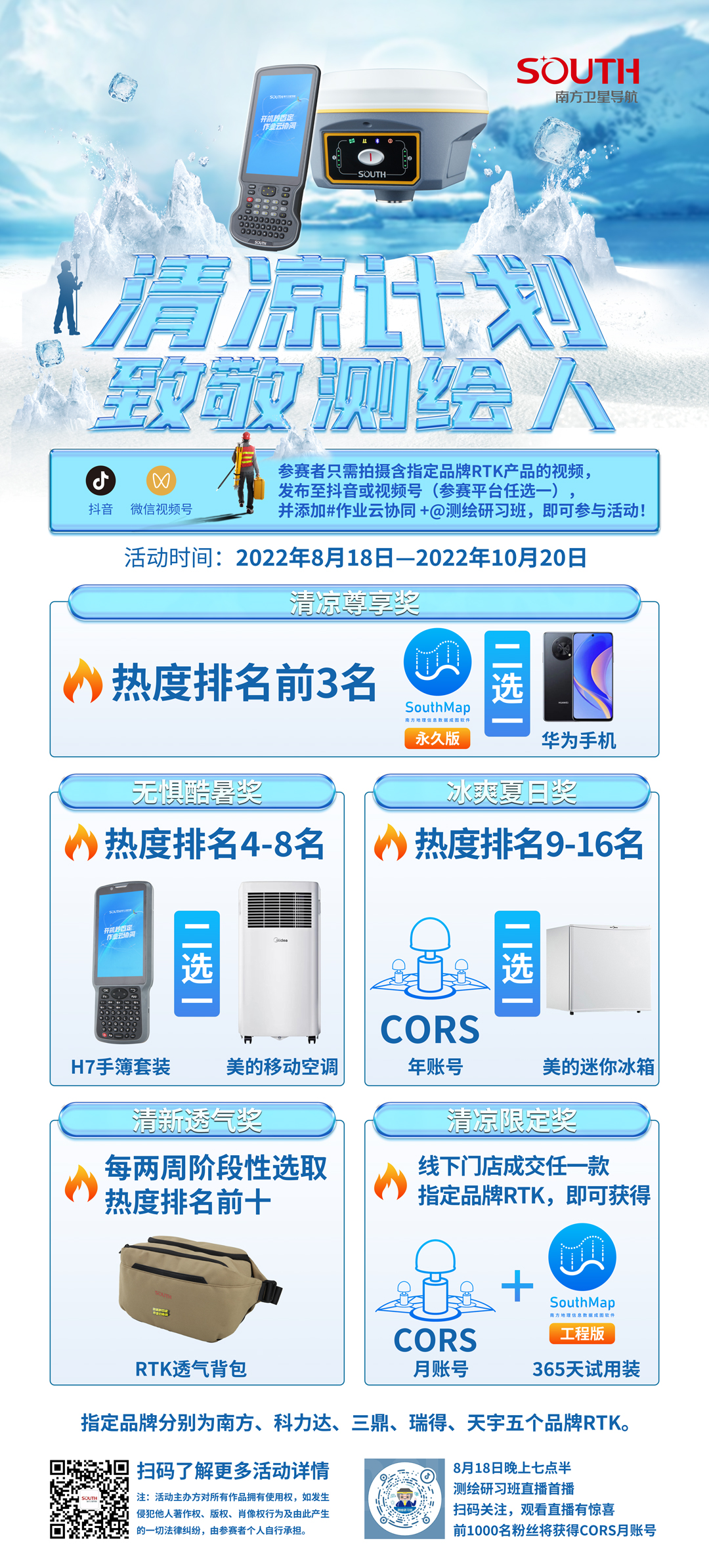 參賽者只需拍攝指定品牌產(chǎn)品的視頻,發(fā)布至抖音或視頻號(hào)(參賽平臺(tái)任選一),并添加 #作業(yè)云協(xié)同 +@測(cè)繪研習(xí)班,即可參與活動(dòng)!1.本次活動(dòng)熱度將根據(jù)視頻點(diǎn)贊數(shù)數(shù)量評(píng)估,熱度排名由抖音和微信視頻號(hào)兩大平臺(tái)參賽視頻匯總排名,清涼尊享獎(jiǎng)、無(wú)懼酷暑獎(jiǎng)、冰爽夏日獎(jiǎng)三個(gè)獎(jiǎng)項(xiàng)為活動(dòng)總熱度排名,清新透氣獎(jiǎng)為每?jī)芍茈A段性熱度排名;2.所有獎(jiǎng)項(xiàng)除清新透氣獎(jiǎng)外,同一參賽者只可獲得單項(xiàng)獎(jiǎng),如參賽者投稿多個(gè)視頻,只以點(diǎn)贊數(shù)最高的單條視頻為準(zhǔn)(同一注冊(cè)賬號(hào)/電話/地址/郵箱等均視為同一參賽者);3.參賽者拍攝作品需為原創(chuàng),出鏡產(chǎn)品為南方、科力達(dá)、三鼎、瑞得、天宇五個(gè)指定品牌,視頻時(shí)長(zhǎng)不限,展現(xiàn)測(cè)繪日常、測(cè)繪場(chǎng)景、測(cè)繪人樂(lè)觀向上的精神面貌等;4.每?jī)芍茉趶V州南方衛(wèi)星導(dǎo)航公眾號(hào)推文及測(cè)繪研習(xí)班抖音直播間公布清新透氣獎(jiǎng),參賽者請(qǐng)密切關(guān)注,獲獎(jiǎng)的參賽者可通過(guò)添加客服微信(SOUTHKEFU)領(lǐng)取獎(jiǎng)品;5.活動(dòng)嚴(yán)禁“刷贊”等弄虛作假行為,一經(jīng)發(fā)現(xiàn)查實(shí),將取消活動(dòng)參與資格;6.8月18日前,帶#南方云協(xié)同+@測(cè)繪研習(xí)班的參賽作品可參與活動(dòng)熱度排名,自8月19號(hào)起,參賽以添加#作業(yè)云協(xié)同+@測(cè)繪研習(xí)班為準(zhǔn),否則視為無(wú)效作品;7.活動(dòng)主辦方對(duì)所有作品擁有使用權(quán),如發(fā)生侵犯他人著作權(quán)、版權(quán)、肖像權(quán)行為及由此產(chǎn)生的一切法律糾紛,由參賽者個(gè)人自行承擔(dān)。
