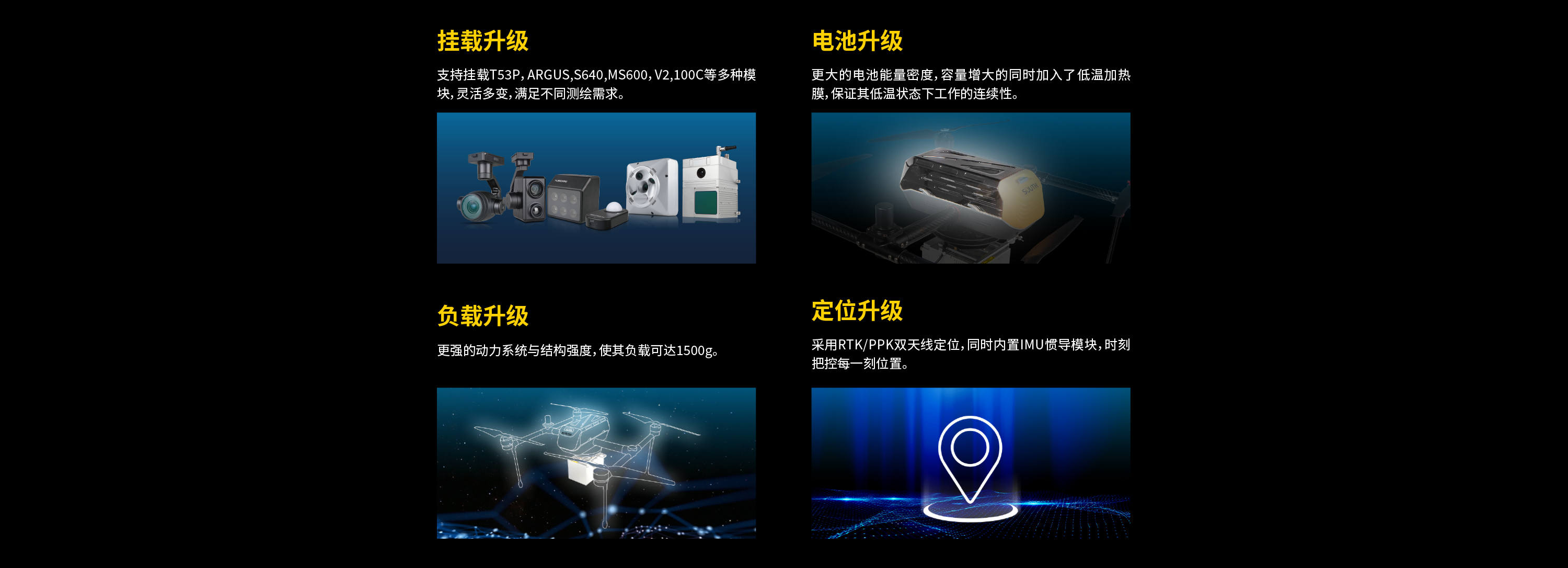 55分鐘載荷320g(正射掛載);45分鐘載荷730g(半畫幅傾斜載荷);33分鐘載荷1200g(全畫幅傾斜載荷、激光)26分鐘載荷1500g