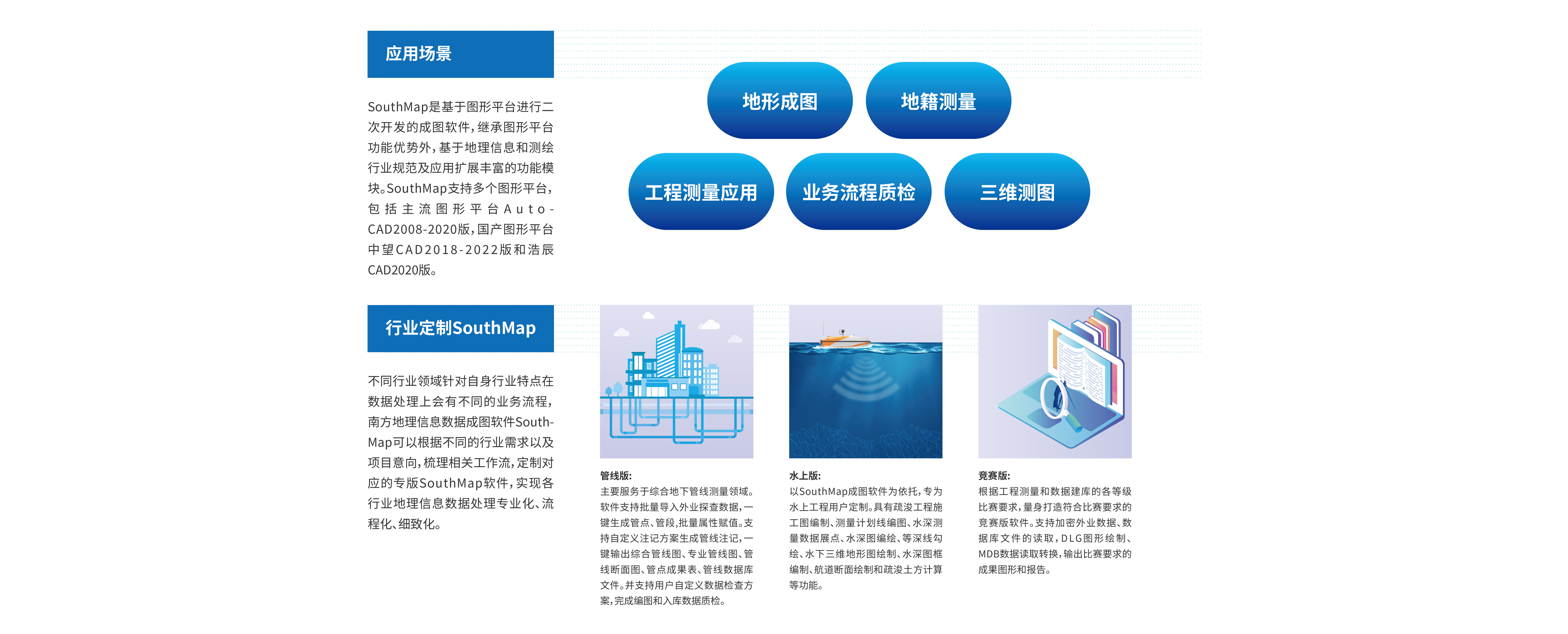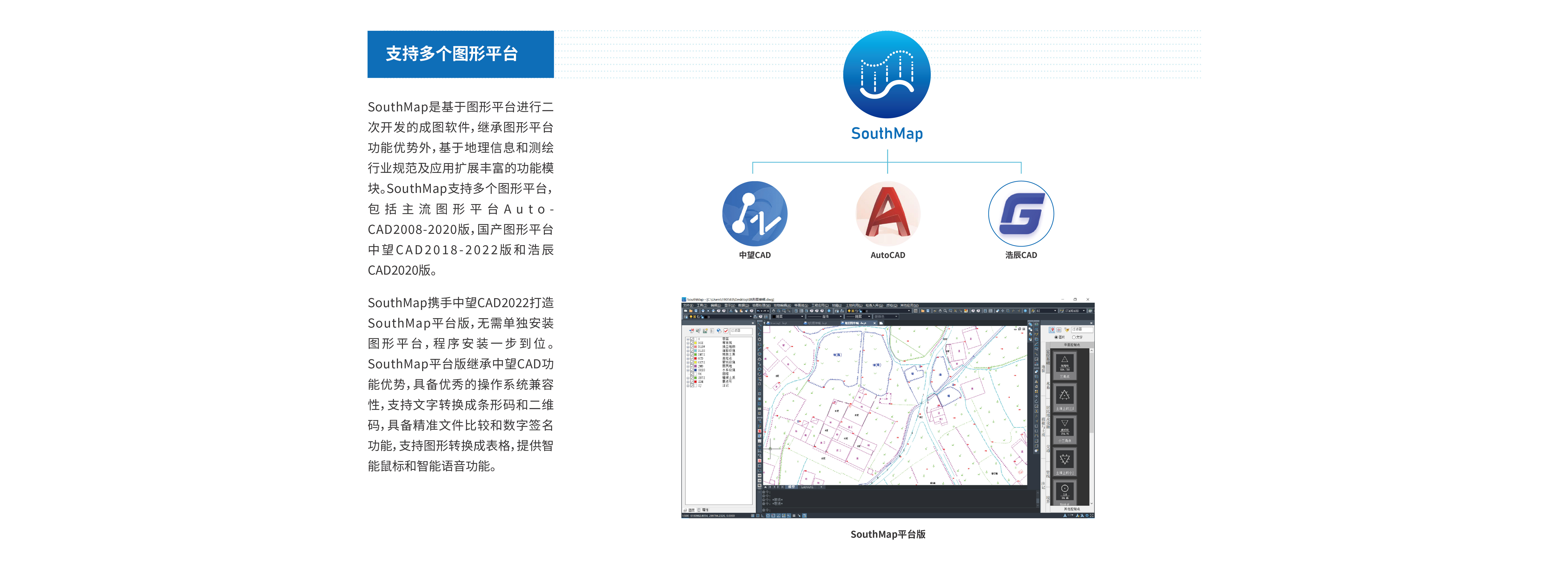 南方地理信息數(shù)據(jù)成圖軟件SouthMap是通過南方測繪20余年軟件研發(fā)經(jīng)驗(yàn),基于AutoCAD和國產(chǎn)CAD平臺,集數(shù)據(jù)采集、編輯、成圖、質(zhì)檢等功能于一體的成圖軟件,主要用于大比例尺地形圖繪制、三維測圖、點(diǎn)云繪圖、日常地籍測繪、工程土石方計算、職業(yè)教育等領(lǐng)域。
