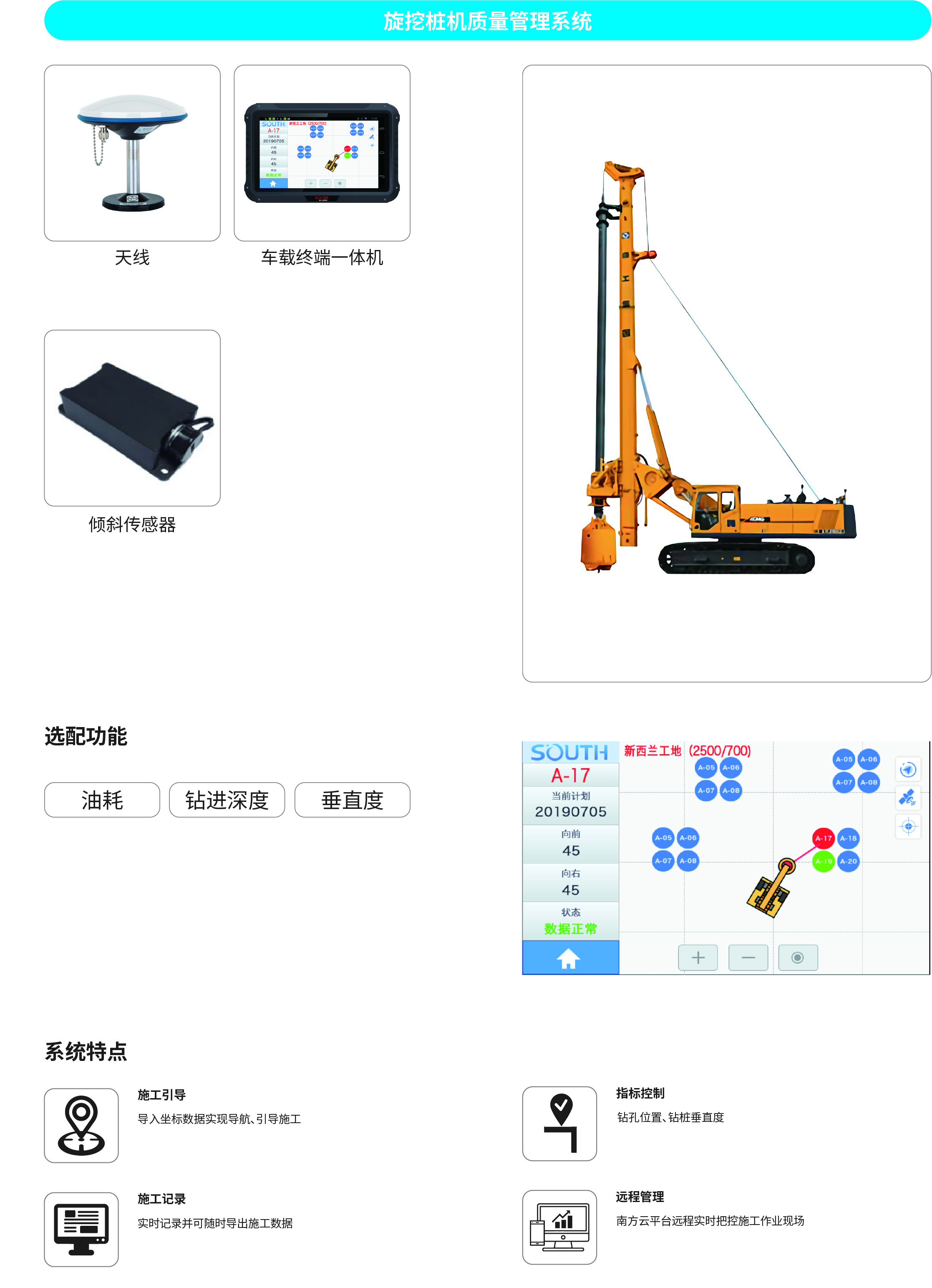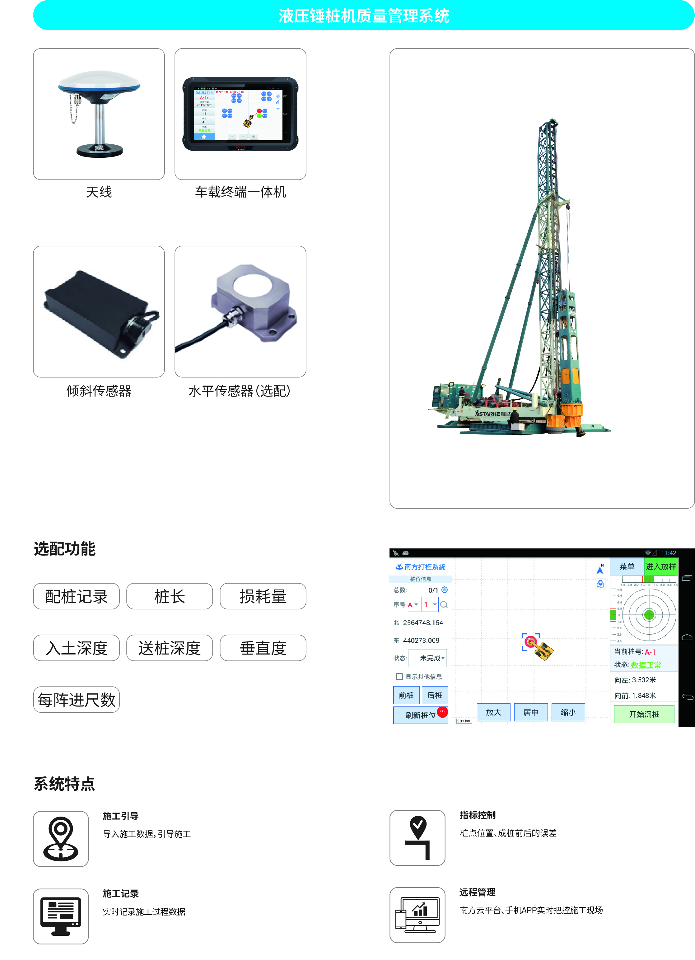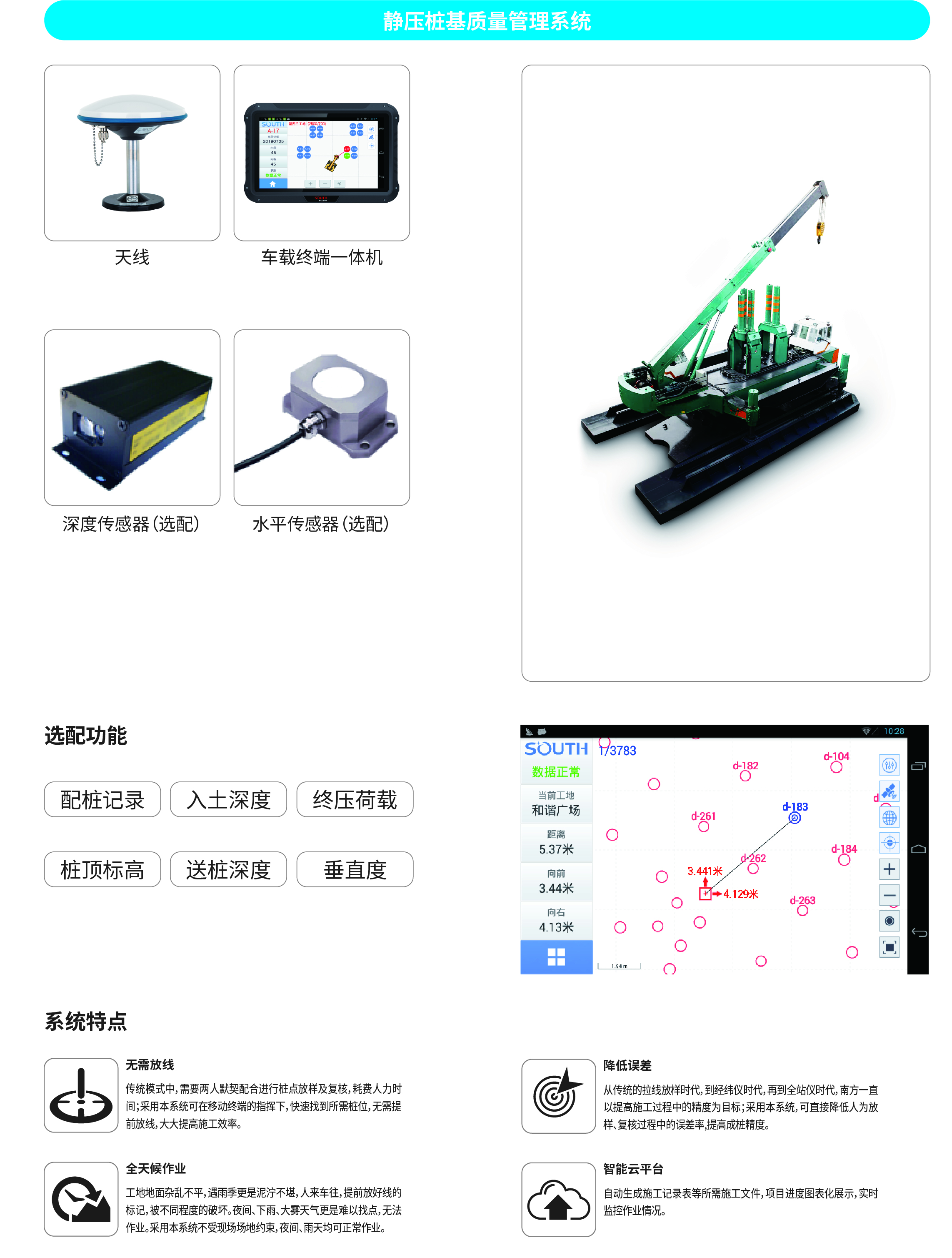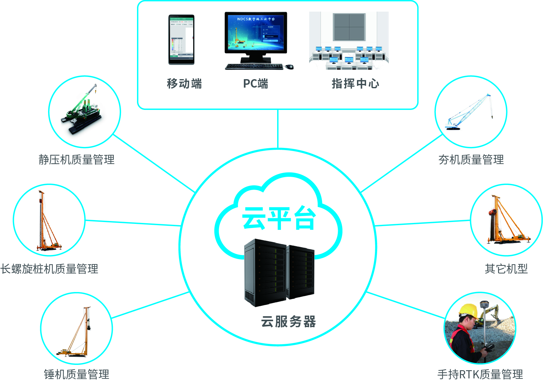 南方NDCS數(shù)字化施工云平臺是依托物聯(lián)網(wǎng)、互聯(lián)網(wǎng)建立的大數(shù)據(jù)管理平臺。平臺以“互聯(lián)網(wǎng)+”為理念,實現(xiàn)了地基處理施工全過程信息化、數(shù)字化、智能化和可視化,為靜壓樁機、液壓錘、柴油錘、長螺旋、旋挖機、多軸樁機等多類基礎(chǔ)機械在施工質(zhì)量管理方面提供整套優(yōu)質(zhì)的綜合解決辦法。平臺可實現(xiàn)對施工進度、施工質(zhì)量、施工設(shè)備的信息化管理以及智能統(tǒng)計、智能預(yù)警、智能化施工等功能,并配備“施工云管家”APP端,實現(xiàn)遠程化項目多設(shè)備管理,讓用戶能實時遠程把控現(xiàn)場施工進度、質(zhì)量,高效管理調(diào)度自有及租賃設(shè)備,有效加強項目風(fēng)險管控與目標(biāo)執(zhí)行。