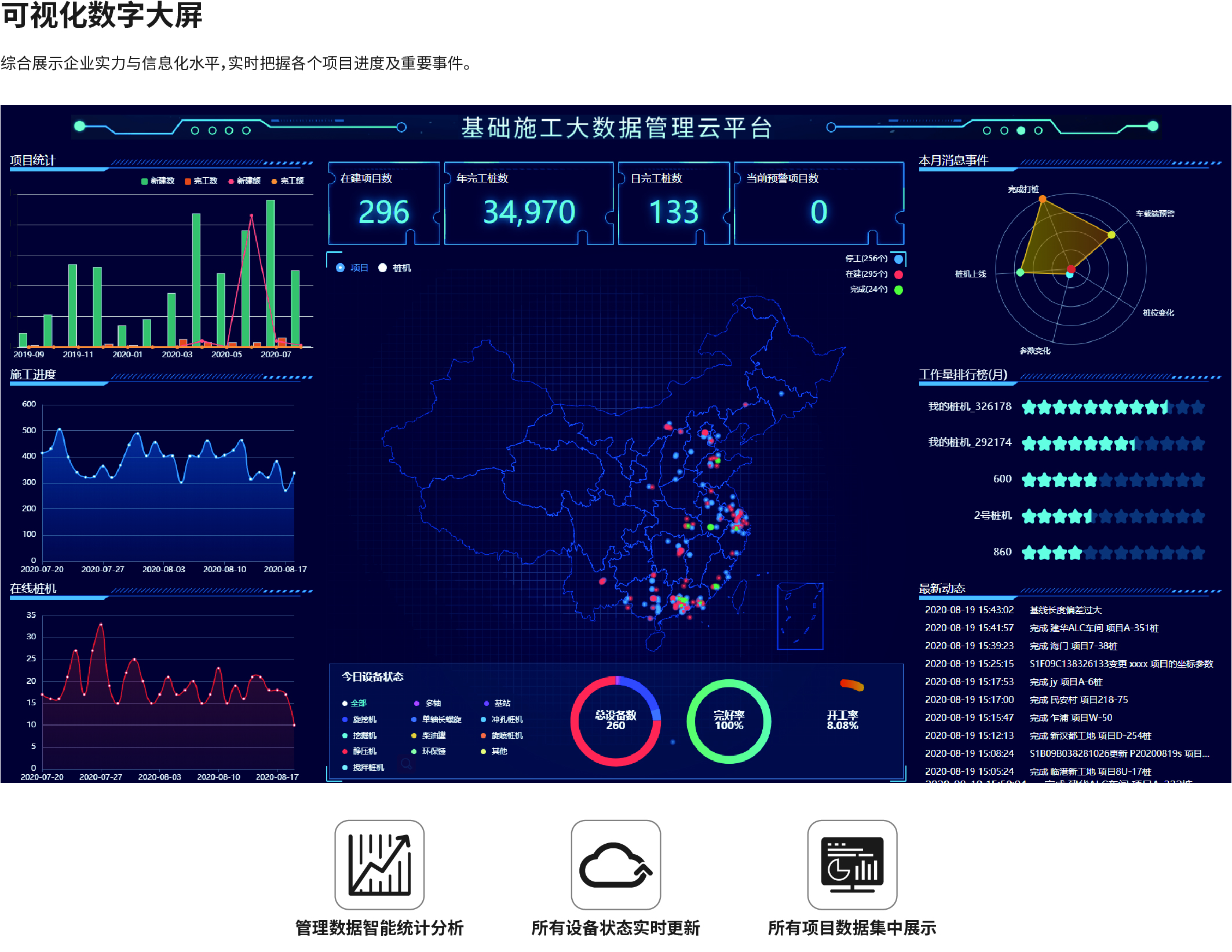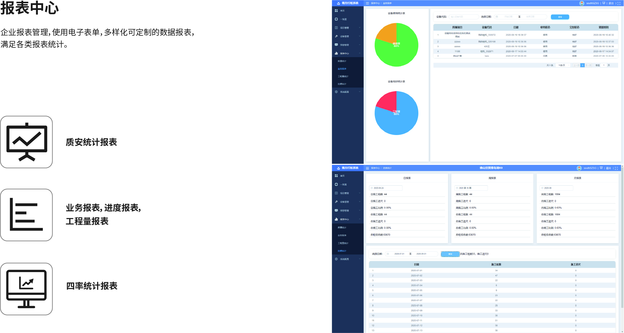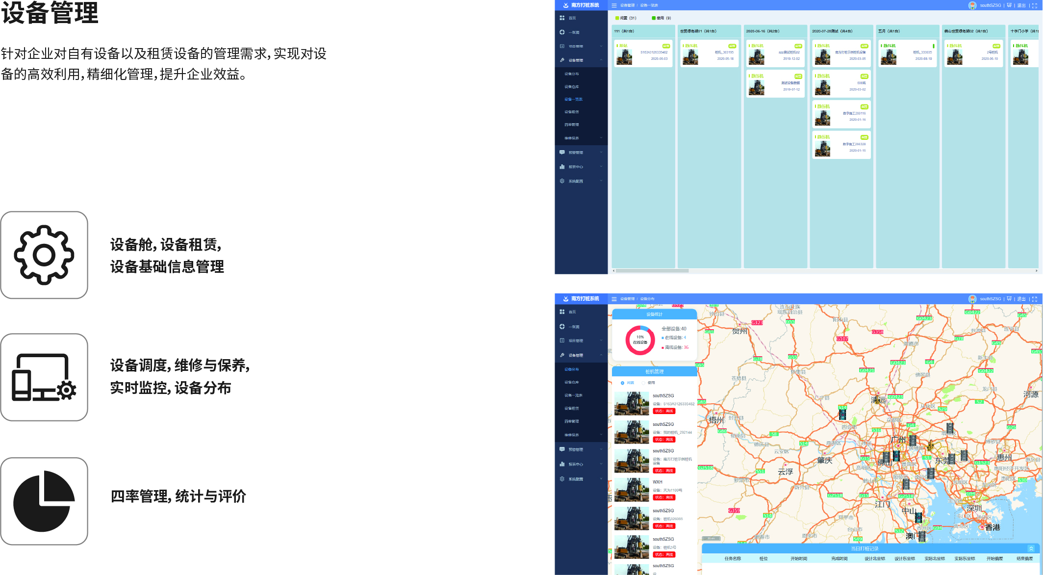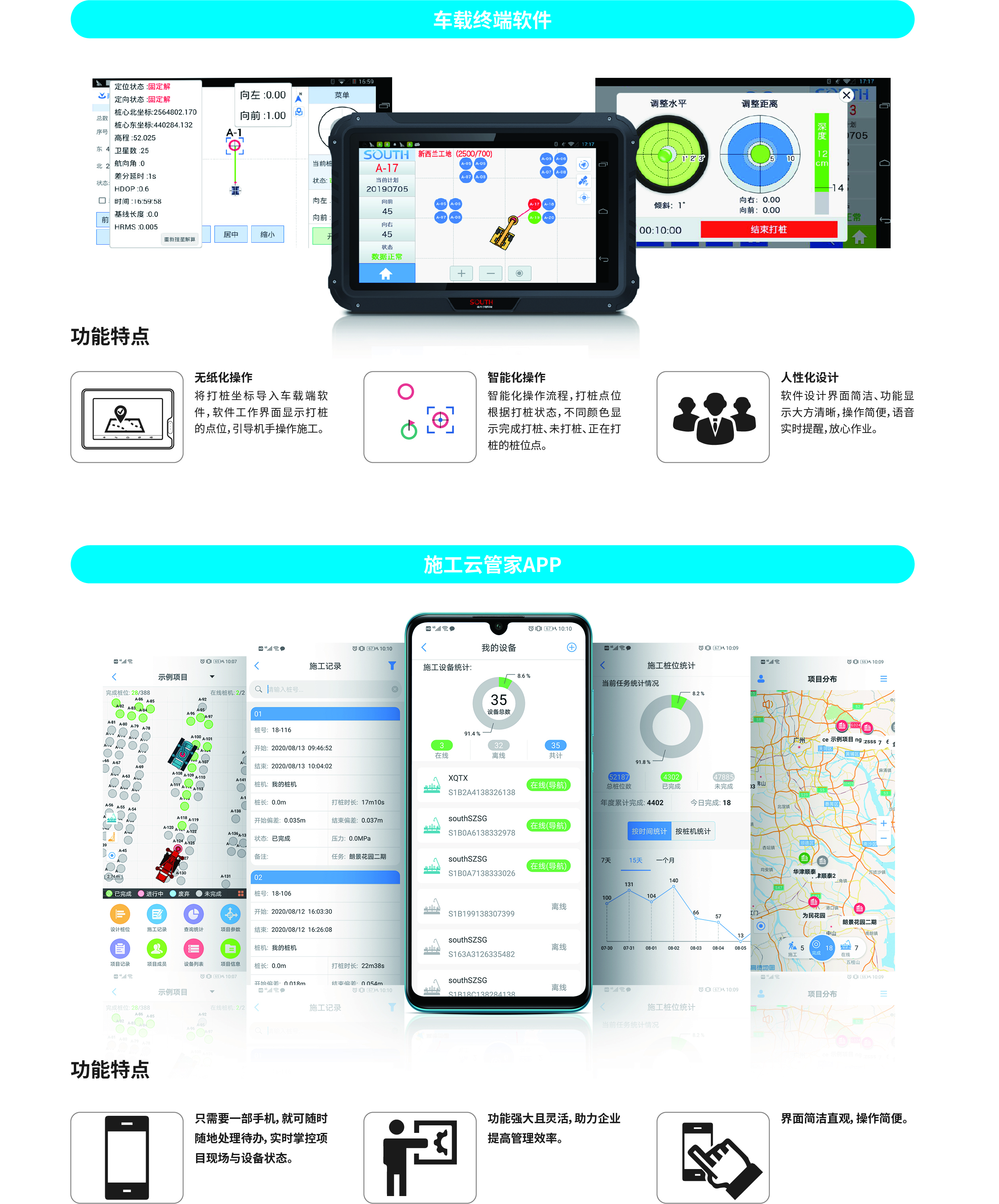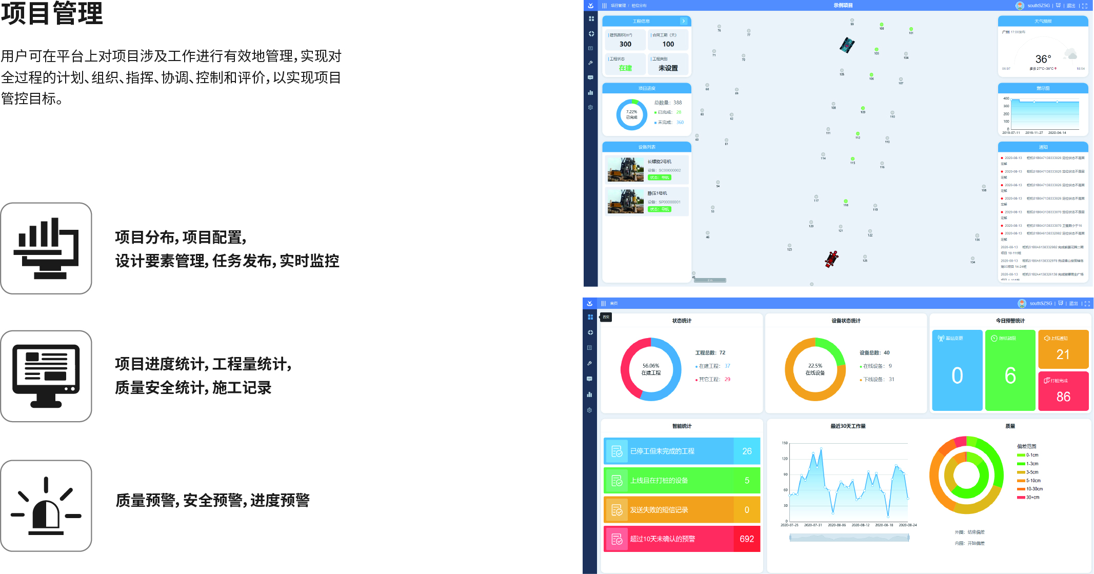 南方NDCS數(shù)字化施工云平臺是依托物聯(lián)網(wǎng)、互聯(lián)網(wǎng)建立的大數(shù)據(jù)管理平臺。平臺以“互聯(lián)網(wǎng)+”為理念,實現(xiàn)了地基處理施工全過程信息化、數(shù)字化、智能化和可視化,為靜壓樁機、液壓錘、柴油錘、長螺旋、旋挖機、多軸樁機等多類基礎(chǔ)機械在施工質(zhì)量管理方面提供整套優(yōu)質(zhì)的綜合解決辦法。平臺可實現(xiàn)對施工進度、施工質(zhì)量、施工設(shè)備的信息化管理以及智能統(tǒng)計、智能預(yù)警、智能化施工等功能,并配備“施工云管家”APP端,實現(xiàn)遠程化項目多設(shè)備管理,讓用戶能實時遠程把控現(xiàn)場施工進度、質(zhì)量,高效管理調(diào)度自有及租賃設(shè)備,有效加強項目風(fēng)險管控與目標(biāo)執(zhí)行。