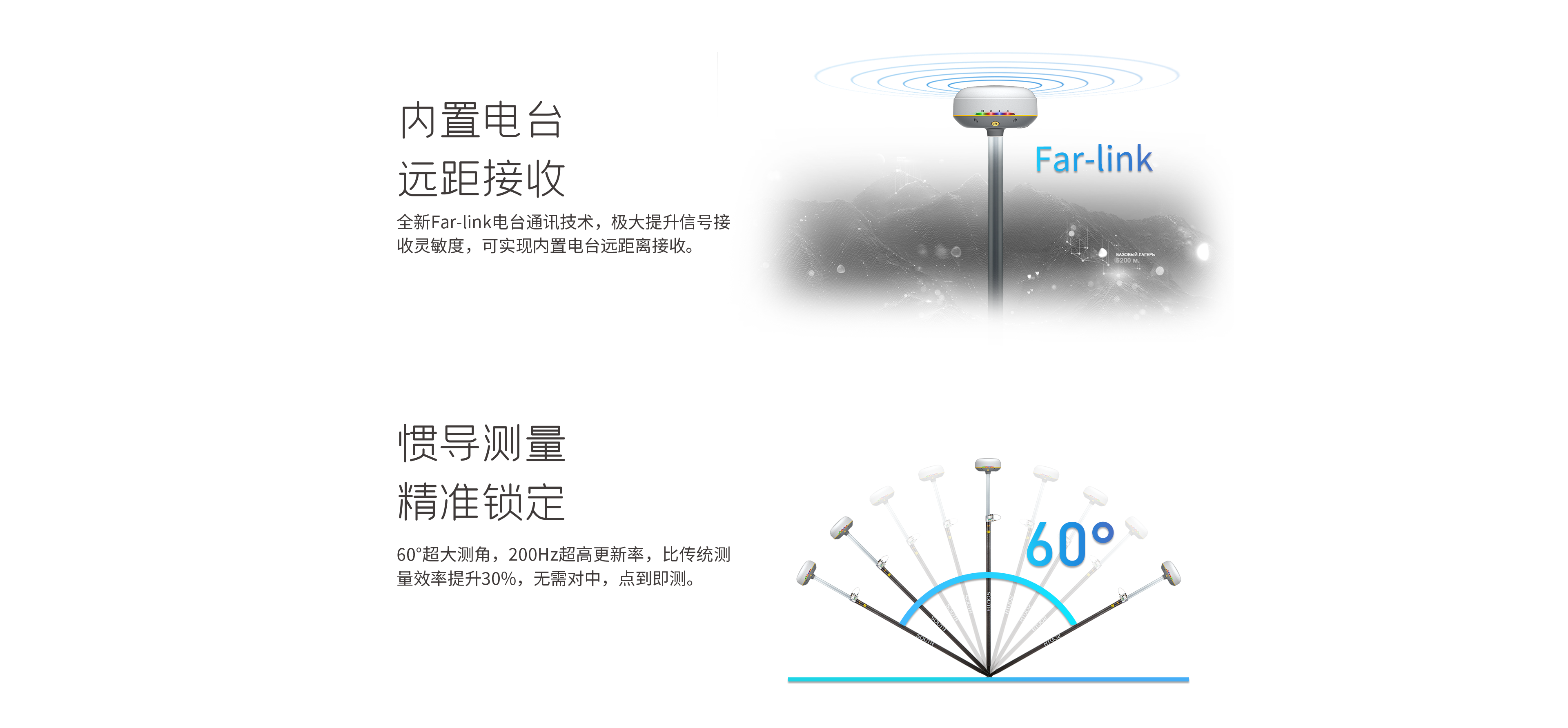 內(nèi)置IMU慣性測量傳感器,支持慣導傾斜測量功能,根據(jù)對中桿傾斜方向和角度自動校正坐標。