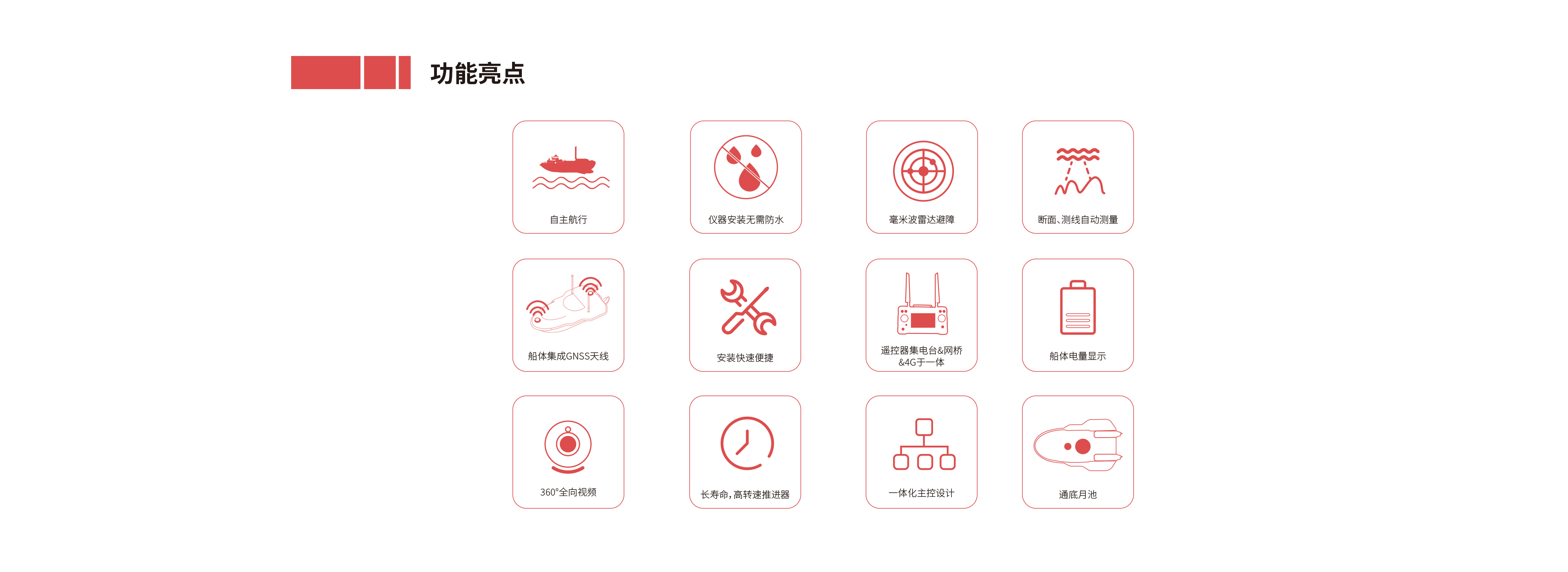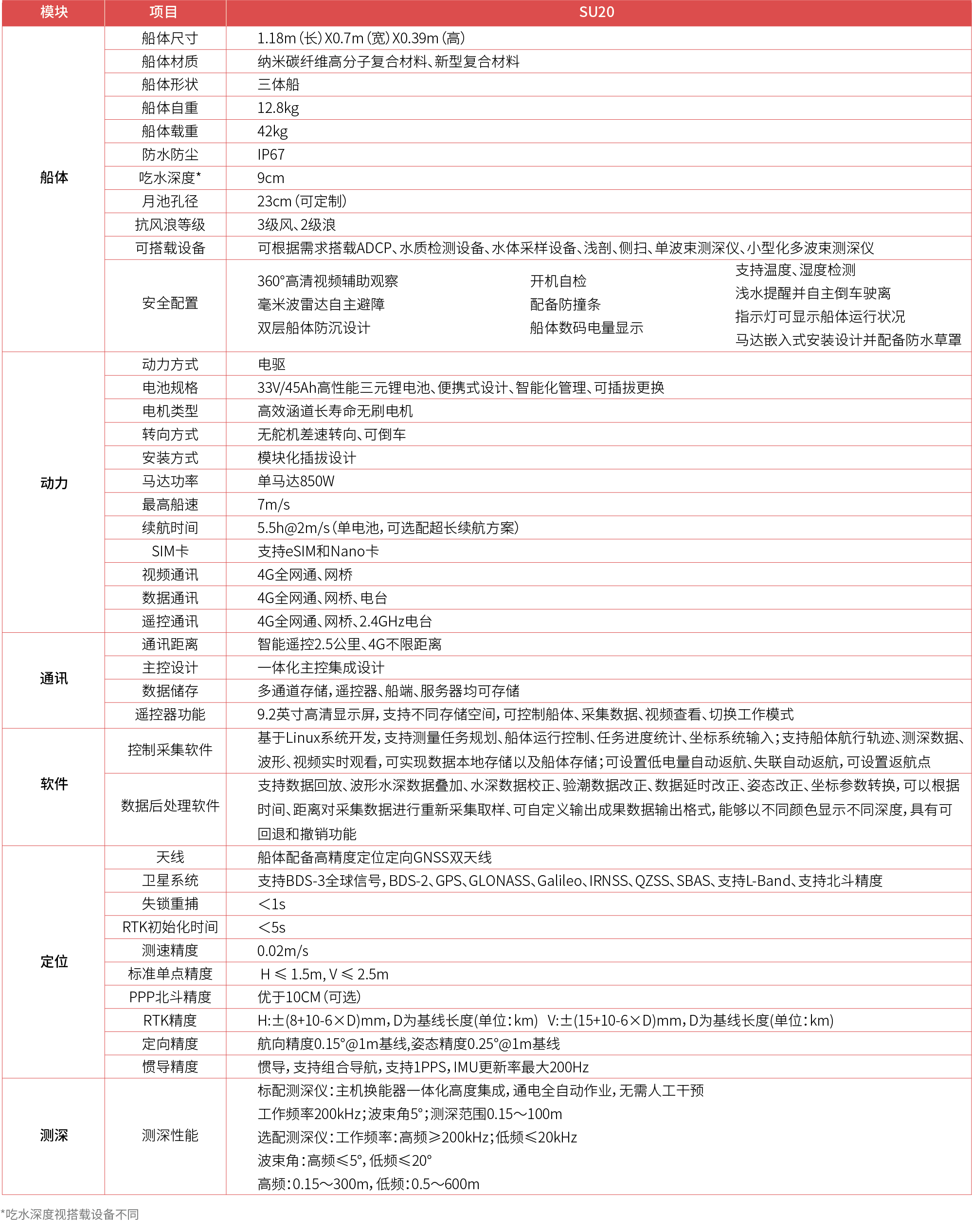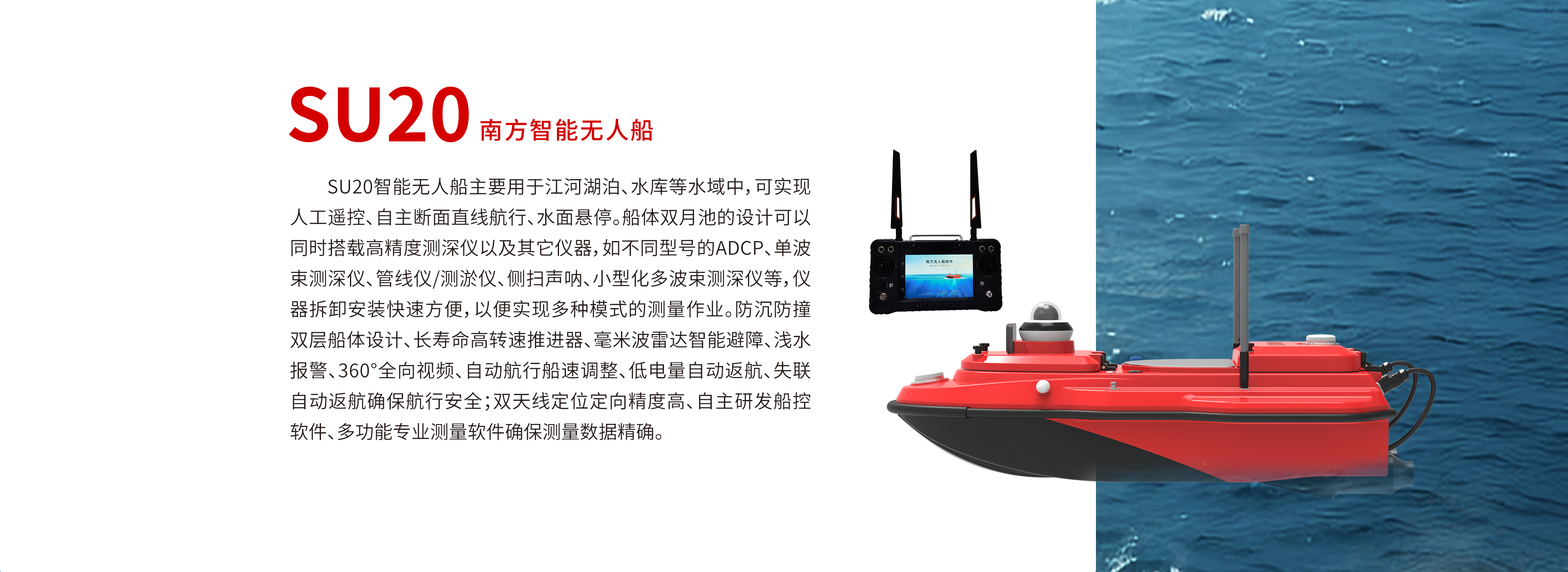 SU20智能無人船主要用于江河湖泊、水庫等水域中,可實現(xiàn)人工遙控、自主斷面直線航行、水面懸停。船體雙月池的設(shè)計可以同時搭載高精度測深儀以及其它儀器,如不同型號的ADCP、單波束測深儀、管線儀/測淤儀、側(cè)掃聲吶、小型化多波束測深儀等,儀器拆卸安裝快速方便,以便實現(xiàn)多種模式的測量作業(yè)。防沉防撞雙層船體設(shè)計、長壽命高轉(zhuǎn)速推進器、毫米波雷達智能避障、淺水報警、360°全向視頻、自動航行船速調(diào)整、低電量自動返航、失聯(lián)自動返航確保航行安全;雙天線定位定向精度高、自主研發(fā)船控軟件、多功能專業(yè)測量軟件確保測量數(shù)據(jù)精確。