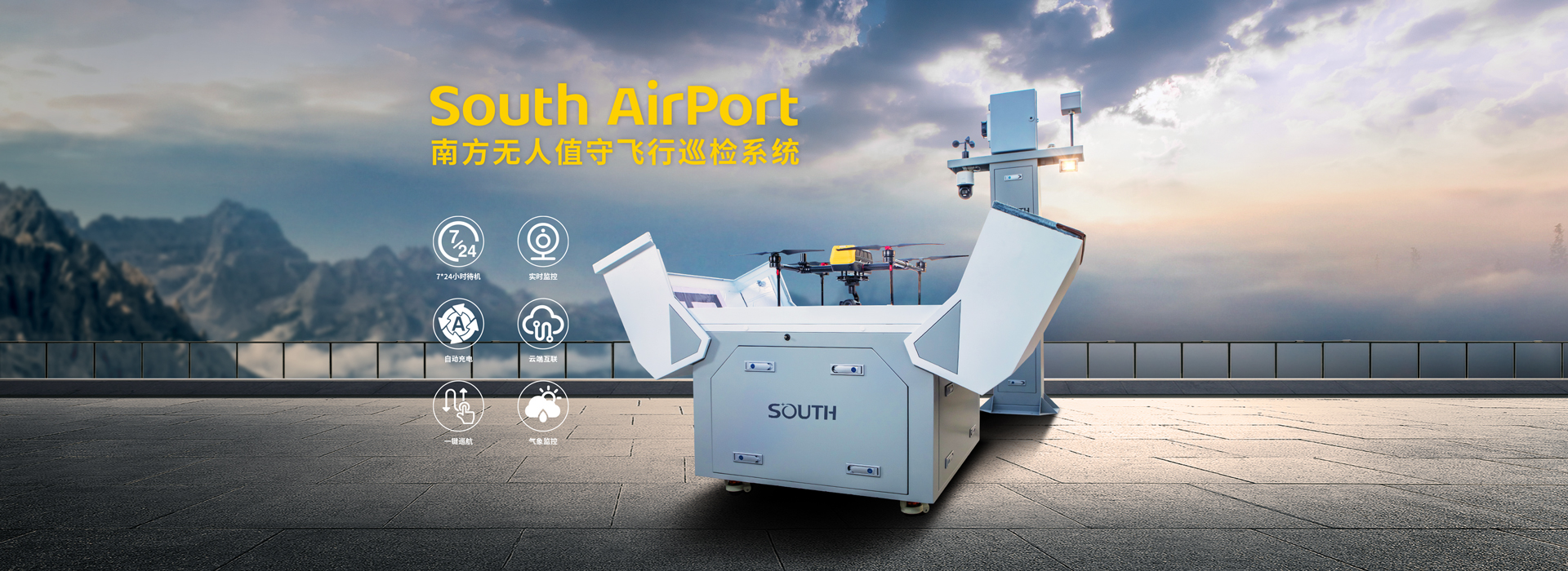 南方SouthAirport無人機場可實現(xiàn)無人機的全自主無人化場景,包括遠程調度、自動起飛、降落、自動無線充電,結合曜宇的云處理平臺,還可實現(xiàn)場景的 AI 處理。 內部結構緊湊合理,占地面積小,便于部署屋頂、野外等固定區(qū)域。內置集成智能空調系統(tǒng),適應復雜環(huán)境,整機防護IP54標準,能抵抗沖擊和震動。采用多控制方式及智能燈光系統(tǒng),能實現(xiàn)夜間精準起降。機械臂2分鐘快速更換電池,滿足無人機高頻次、連續(xù)性、常態(tài)化巡飛作業(yè)要求。