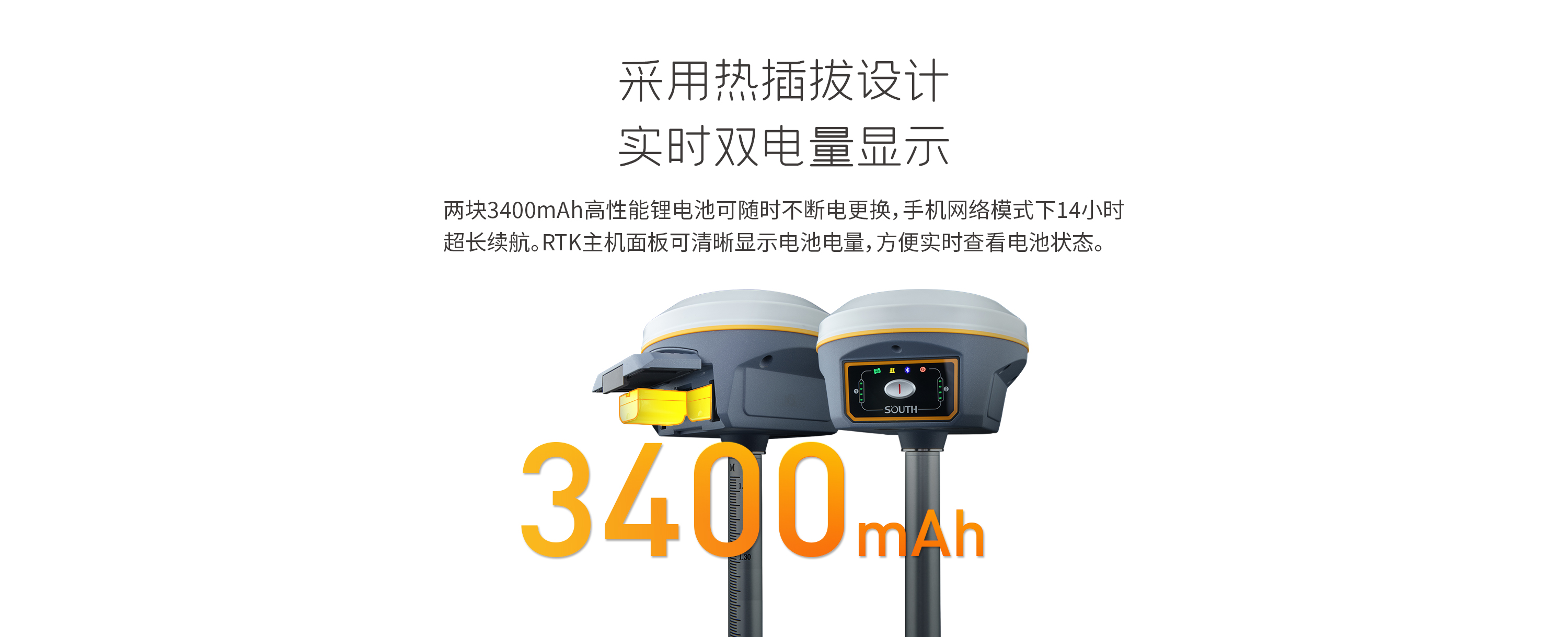 移動站手簿網(wǎng)絡(luò)模式作業(yè)滿足14小時續(xù)航時間,支持桿狀電池棒供電方式,可支持其他變壓供電系統(tǒng),